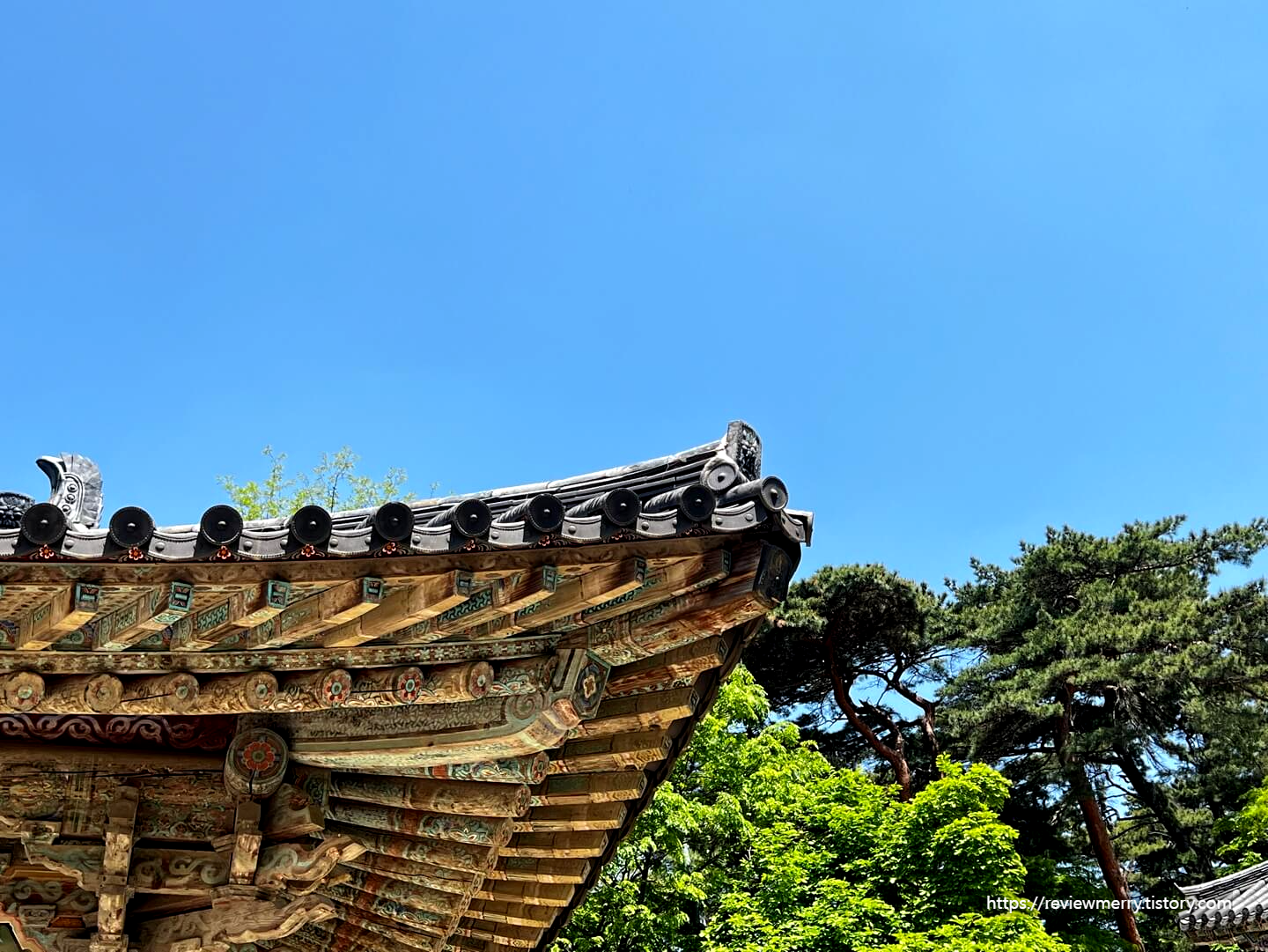 뒤로 보이는 초록빛깔 나무와 푸른 하늘, 한국 건축물의 조화가 정말 멋있어요.