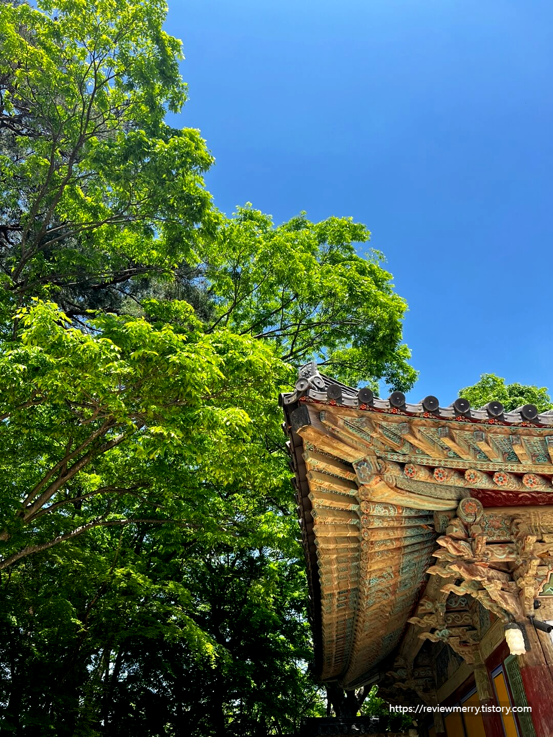 뒤로 보이는 초록빛깔 나무와 푸른 하늘, 한국 건축물의 조화가 정말 멋있어요.