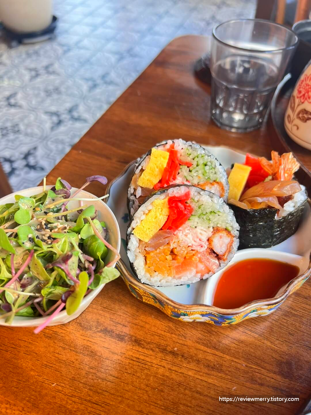 계란말이, 연어, 새우튀김, 각종야채로 속이 꽉꽉 차 있어서 진짜 너무 맛있었어요!!