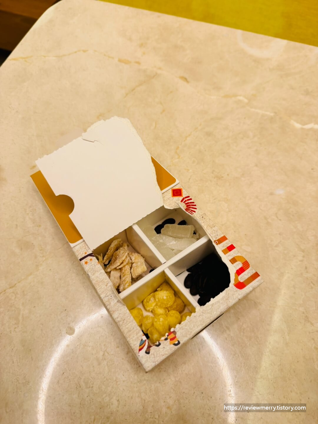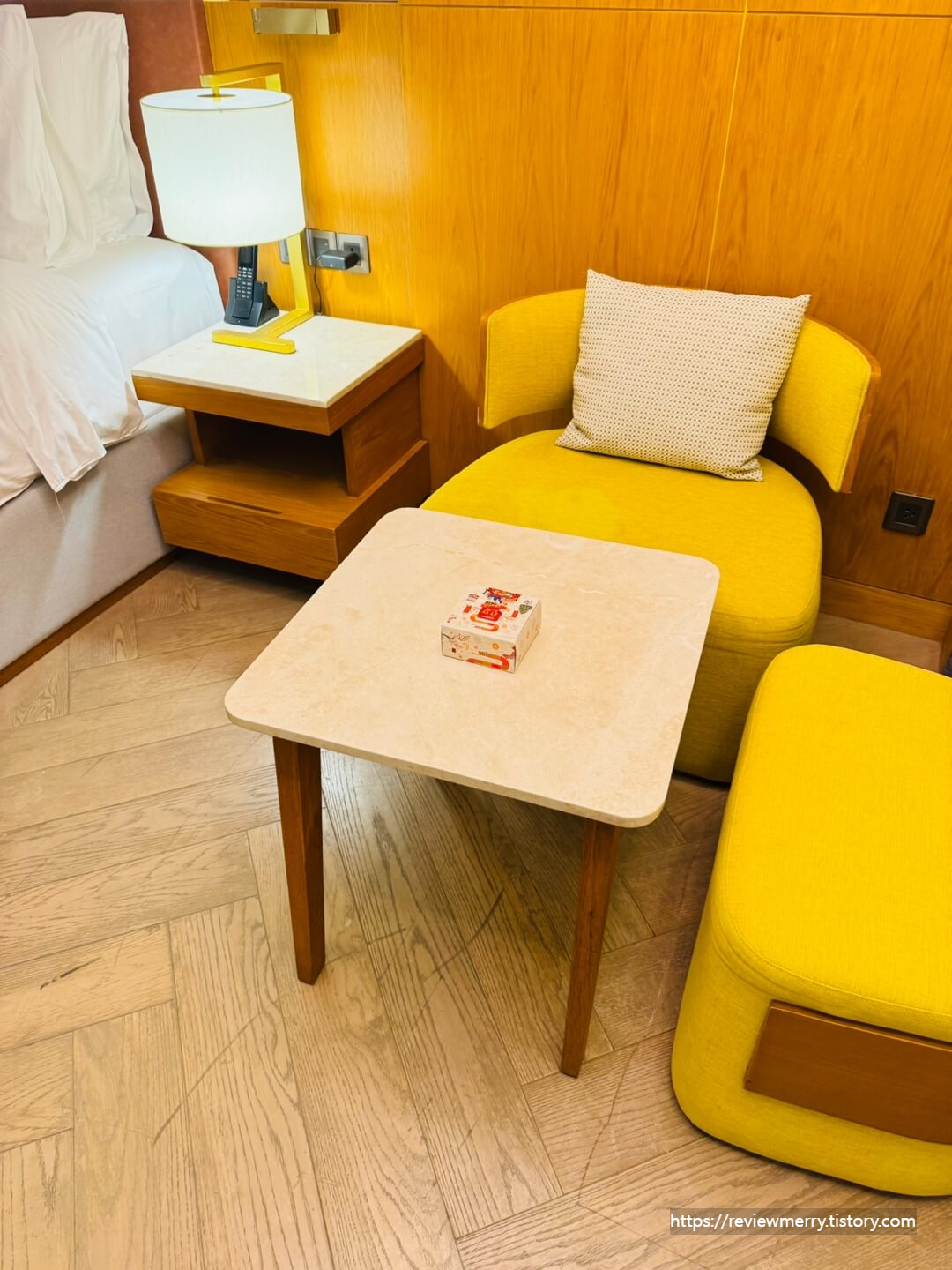 침대 옆에는 간단한 다과를 즐길 수 있는 테이블과 소파가 있었는데 여기에 무료간식이 있어서 살짝 맛봤는데.....