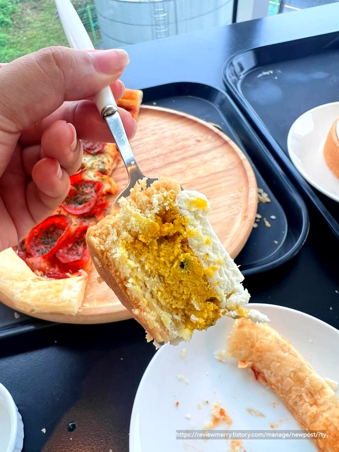 함께 간 친구가 다른 카페에서 똑같이 생긴 케이크를 먹어본 적이 있는데 맛있었다고 강력 추천해서 주문한 메뉴였는데 제 입맛에도 정말 맛있었어요. 하지만 그렇기에 알 수 있었던 점이 남해다 카페는 직접 케이크를 만들지 않고 업체에서 케이크를 받아서 판매한다는 점이랍니다. 하지만 그럼에도 맛은 정말 좋았어서.. 혹시 재방문한다면 또 한 번 주문할 것 같아요. 너무 달지도 않고 그렇다고 너무 심심하지도 않은 적당한 단맛의 단호박과 크림치즈, 쿠키 등이 어우러진 맛이 정말 좋았답니다.