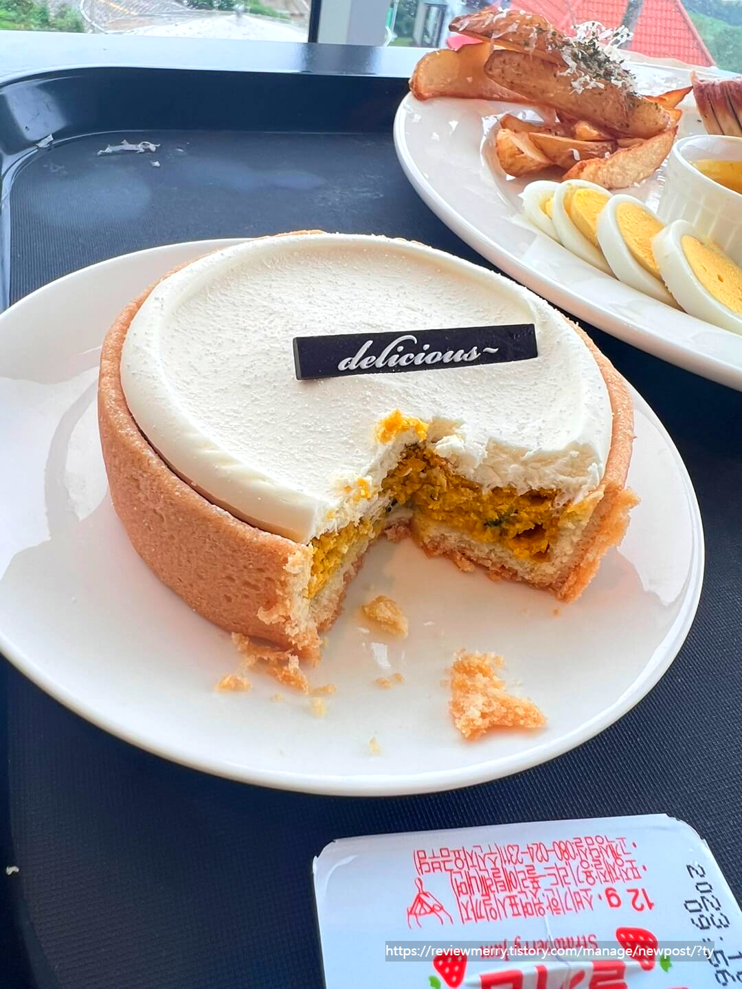 함께 간 친구가 다른 카페에서 똑같이 생긴 케이크를 먹어본 적이 있는데 맛있었다고 강력 추천해서 주문한 메뉴였는데 제 입맛에도 정말 맛있었어요. 하지만 그렇기에 알 수 있었던 점이 남해다 카페는 직접 케이크를 만들지 않고 업체에서 케이크를 받아서 판매한다는 점이랍니다. 하지만 그럼에도 맛은 정말 좋았어서.. 혹시 재방문한다면 또 한 번 주문할 것 같아요. 너무 달지도 않고 그렇다고 너무 심심하지도 않은 적당한 단맛의 단호박과 크림치즈, 쿠키 등이 어우러진 맛이 정말 좋았답니다.