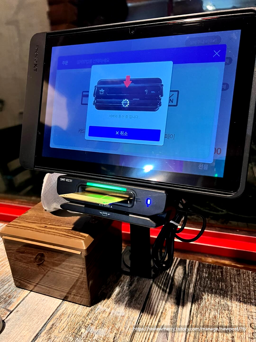 위 사진처럼 주문 후 카드단말기에 카드를 삽입하면 바로 결제까지 완료돼요.