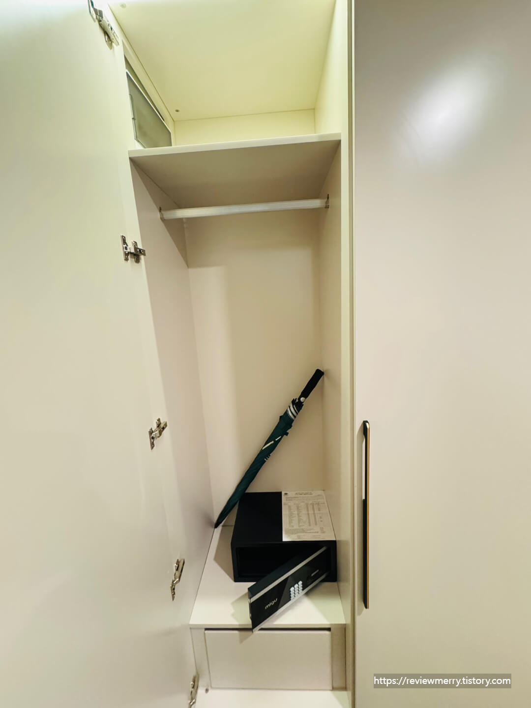 입구에는 캐리어를 올려둘 수 있는 공간과 옷장, 그리고 금고와 우산 등이 들어있는 수납장이 마련되어 있었답니다.