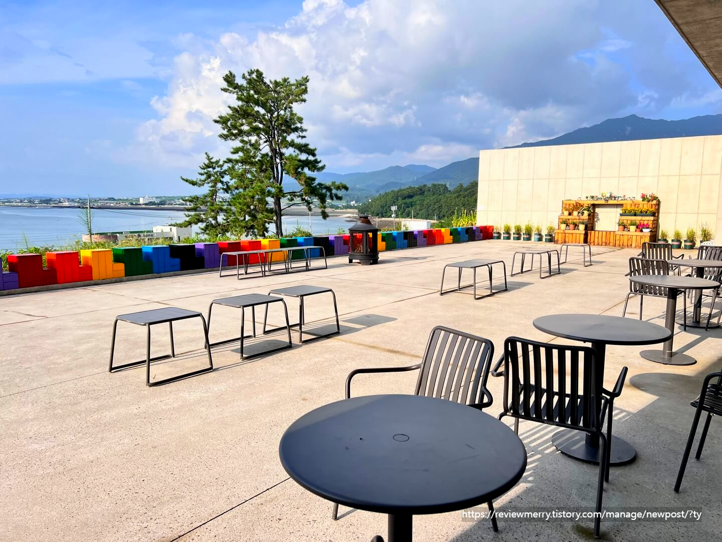 1층을 통해 야외로 나가면 창가로 보였던 무지개의자들이 있으며 그 앞으로는 테이블도 마련되어 있어 선선한 날에는 여기서 커피를 즐겨도 좋을 것 같아요.