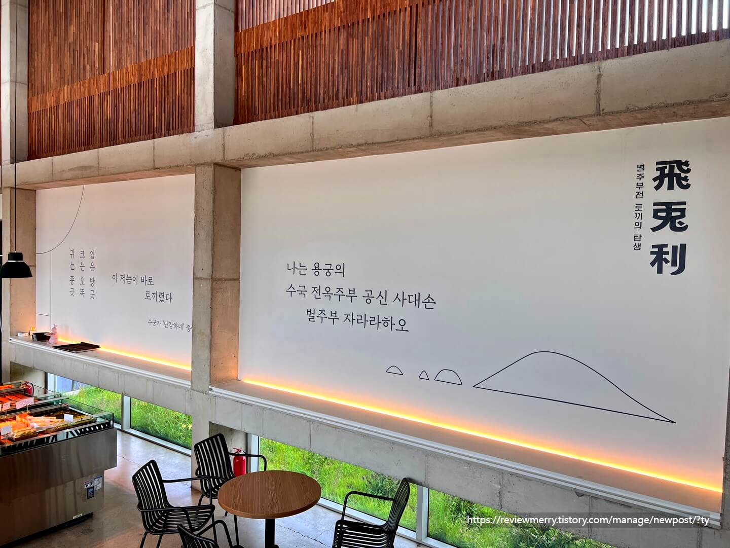 1층은 야외로 나가는 통로와 메뉴를 주문하고 제조하는 곳, 베이커리류가 진열된 진열대 등이 마련되어 있었답니다. 야외로 나가는 통로 앞과 카페 곳곳의 인테리어들이 토끼와 자라들로 이루어져 있어 이 카페의 콘셉트를 바로 느낄 수 있어 너무 좋았어요.
