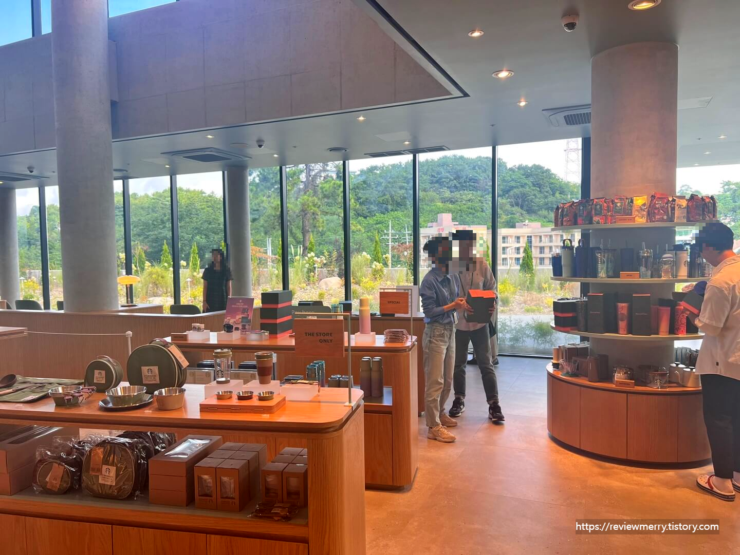 처음 주차장에서 매장으로 들어오면 위와 같이 MD를 판매하는 공간도 마련되어 있는데 현재 인기 있는 블랙핑크와의 콜라보 제품들과 여수에서만 구매할 수 있는 MD들이 판매되고 있어 실제 음료 대기 줄보다 MD 구매 줄이 더 길 정도로 많은 인기가 있답니다.