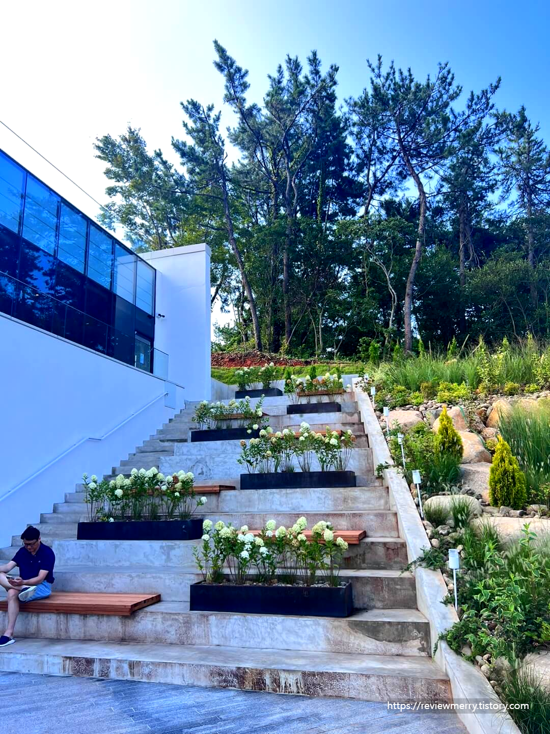앞서 위에서 보신 야외 계단을 통해 올라오면 이런 공간이 나오는데 정말 여수 아닌 듯한 느낌과 넓은 바다 그리고 고급스럽게 인테리어 된 길이 너무 마음에 들었답니다.