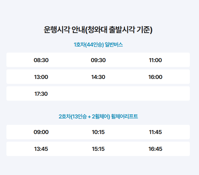 44인승 일반버스도 운행되지만 휠체어리프트가 있는 셔틀버스도 있으니 참고하시면 좋을 것 같습니다.