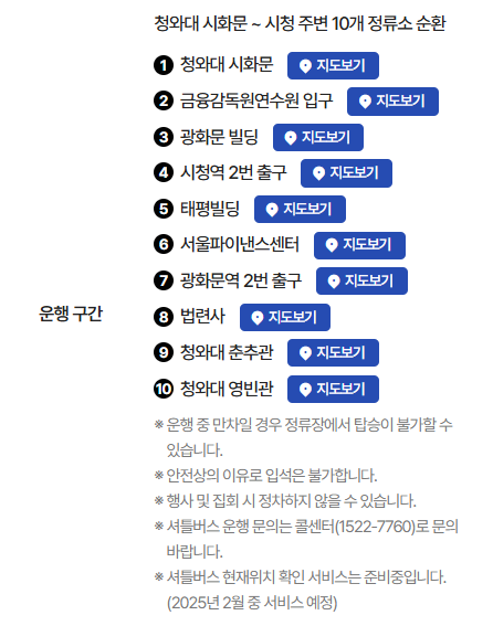 광화문 광장 쪽에서 숭례문 앞까지 운행되는 청와대 셔틀버스를 이용해 보셔도 좋을 것 같아요:-)