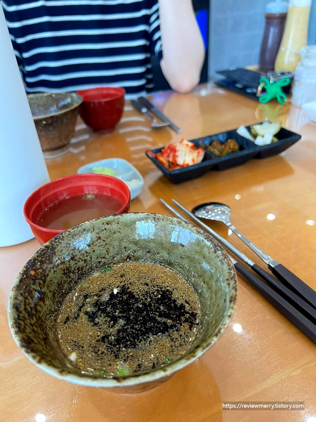 이렇게 면 한가닥을 따로 제공된 육수에 퐁당 담가서 먹으면 되는 형태라 약간 소바 먹는 기분이 들었답니다.