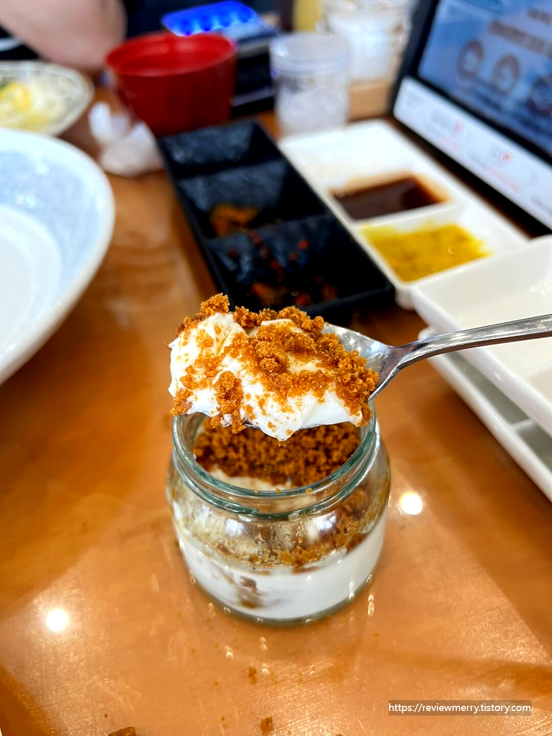 아래는 우유푸딩이 있고 위에는 로투스 가루가 가득 올라가 있어서 정말 달달했어요.