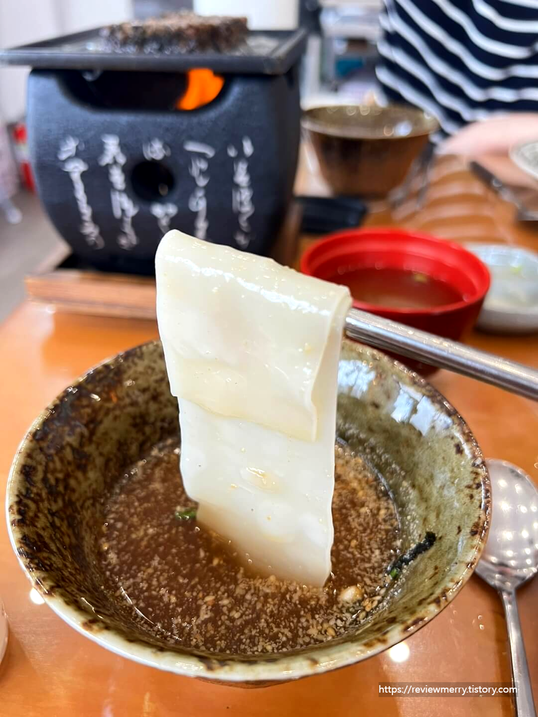 이렇게 면 한가닥을 따로 제공된 육수에 퐁당 담가서 먹으면 되는 형태라 약간 소바 먹는 기분이 들었답니다.