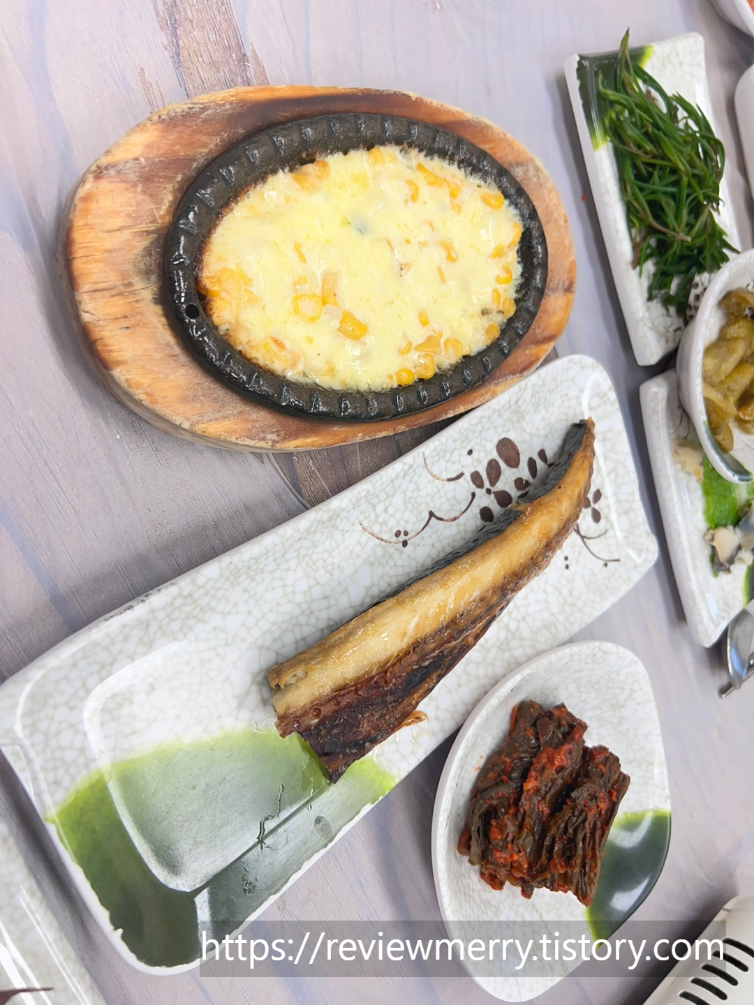 죽을 주문 하면 고등어구이와 갓김치 콘치즈가 함께 제공되어 죽과 함께 먹으면 되고 죽이 나온 후 후식으로 새우튀김 및 고구마튀김이 제공된다.