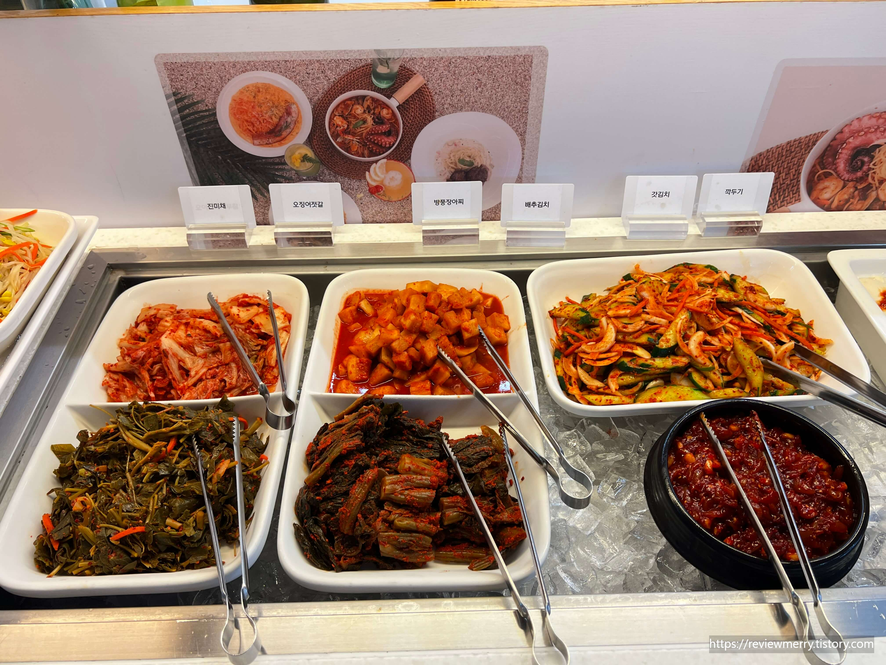 비빔밥 코너 옆으로는 다양한 종류의 김치 들와 오징어 젓갈이 있었답니다.