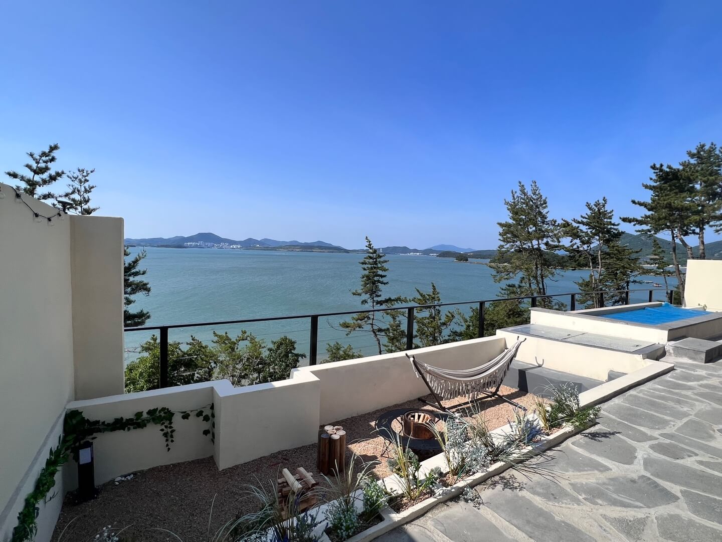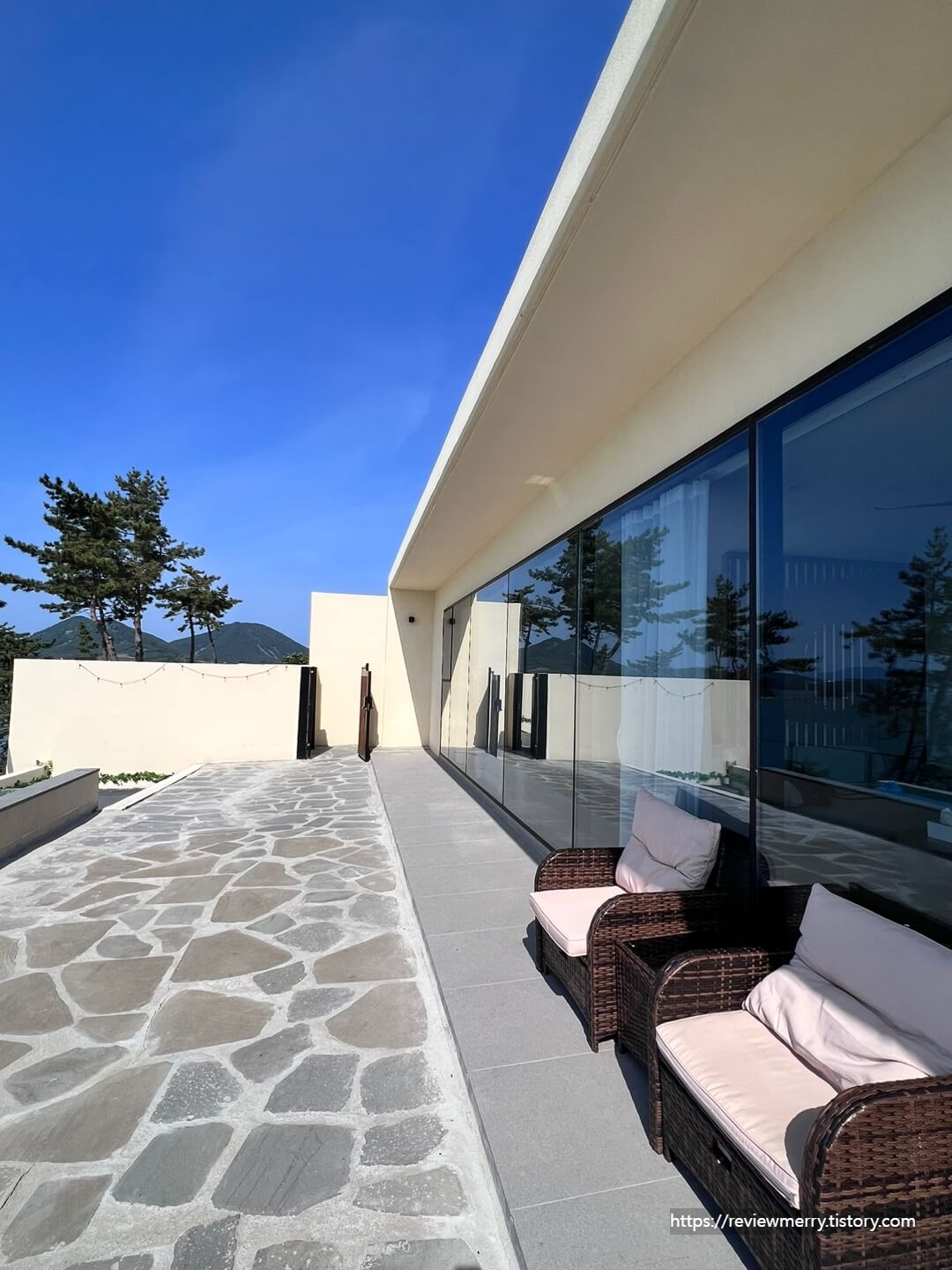 숙소 통창 앞으로 의자 2개가 구비되어 있어 아침에 커피 한잔 하면 바로 앞 오션뷰를 통해 일출을 볼 수 있고, 바로 앞 개별 수영장, 그 옆으로 불멍존, 숙소 옆 캠핑장이 설치되어 있다.