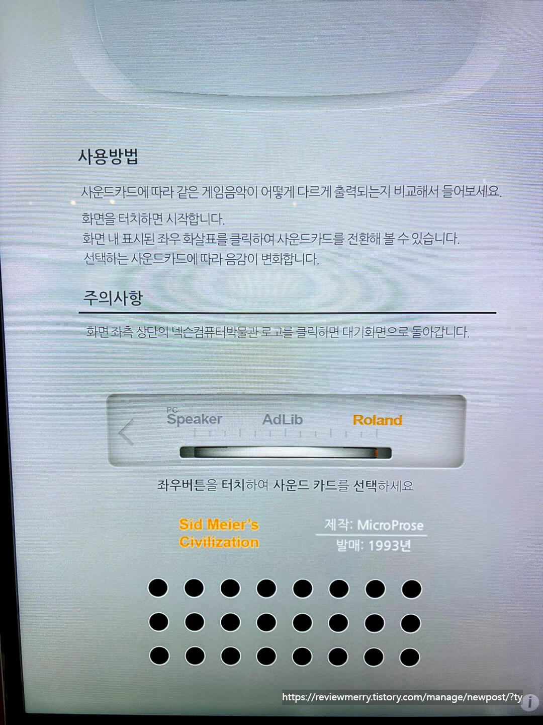 같은 음악을 사운드카드에 따라 어떻게 출력되어 들리는지 확인할 수 있었는데 실제 PC Speaker와 AdLib, Roland에서 들리는 음악이 확실히 달라서 너무 신기했어요!