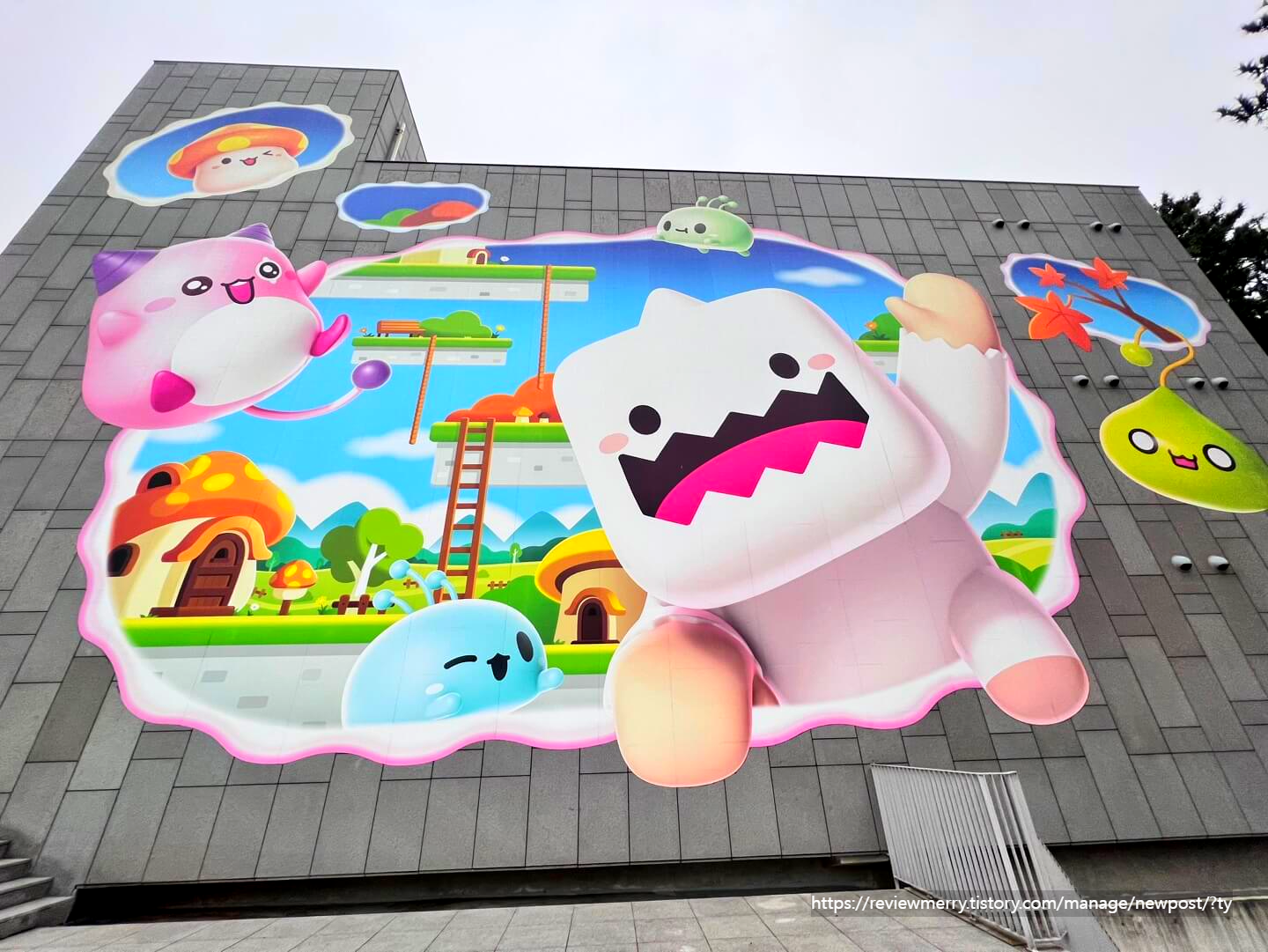 넥슨 게임으로 유명한 메이플스토리 캐릭터들이 엄청 크게 건물 외벽에 그려져 있어서 아이들이 정말 좋아할 것 같았어요.