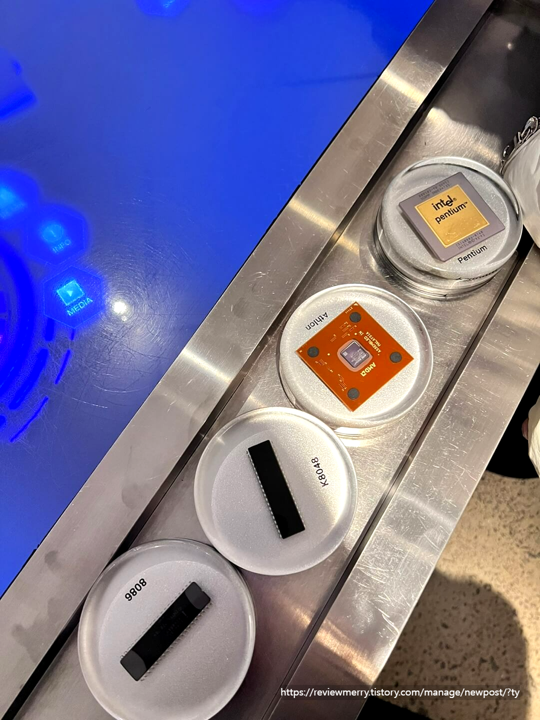 과거 컴퓨터의 형태뿐 아니라 사용되었던 컴퓨터 칩들도 회사별로 전시되어 있었는데!