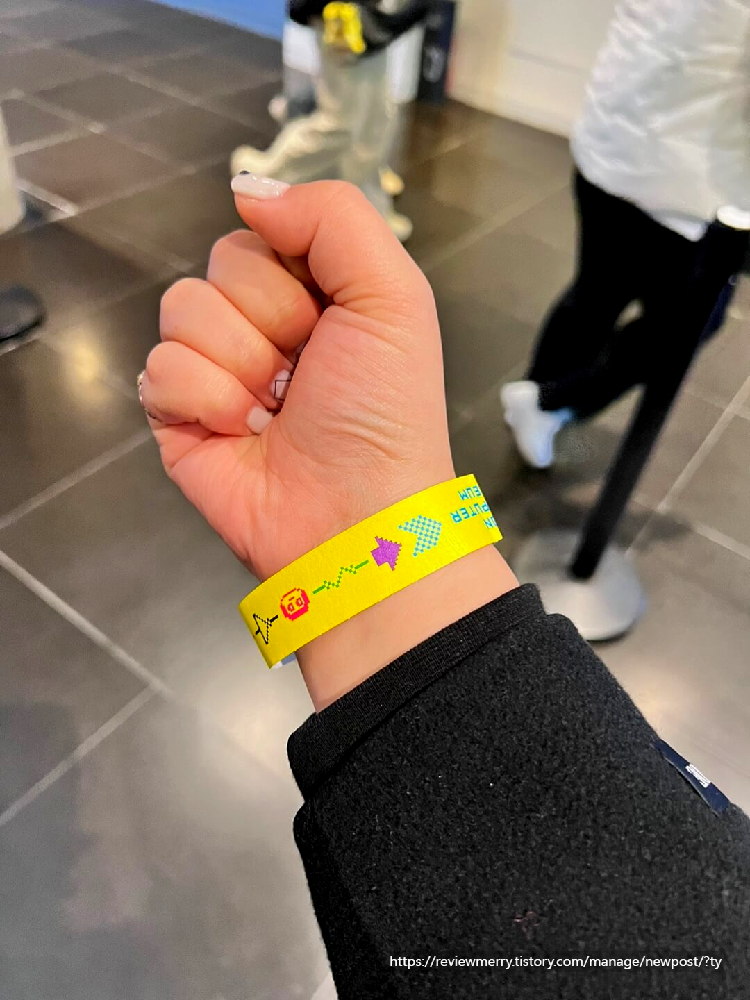 티켓은 우측사진과 같이 팔목에 티켓팔찌를 채워주시는데 당일 재입장은 언제든지 몇 번이고 가능하다고 해요!