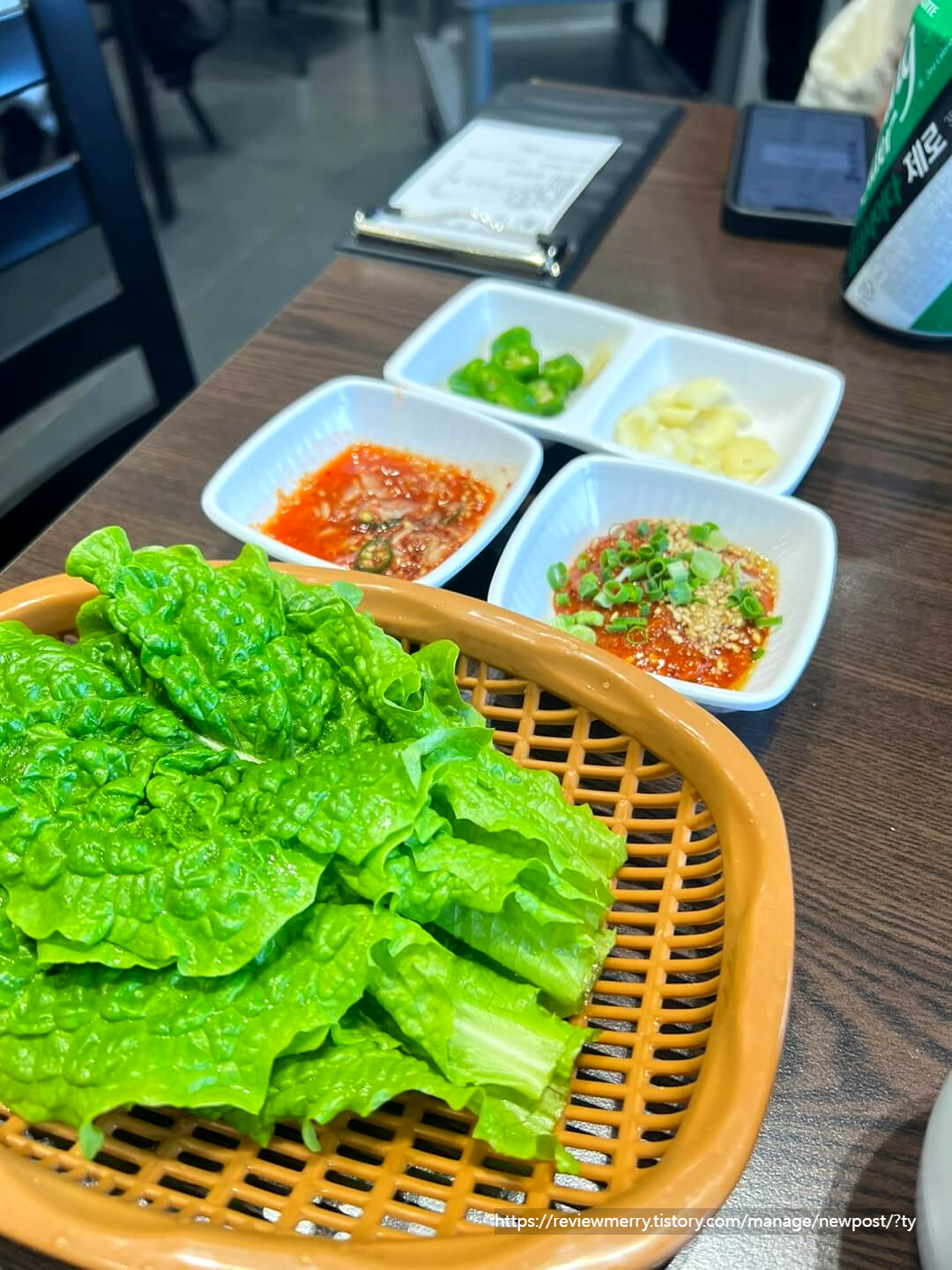 기본반찬은 김치, 쌈채소, 소스를 가져다주시고 각종 조미료는 책상에 기본적으로 세팅되어 있어요:-)