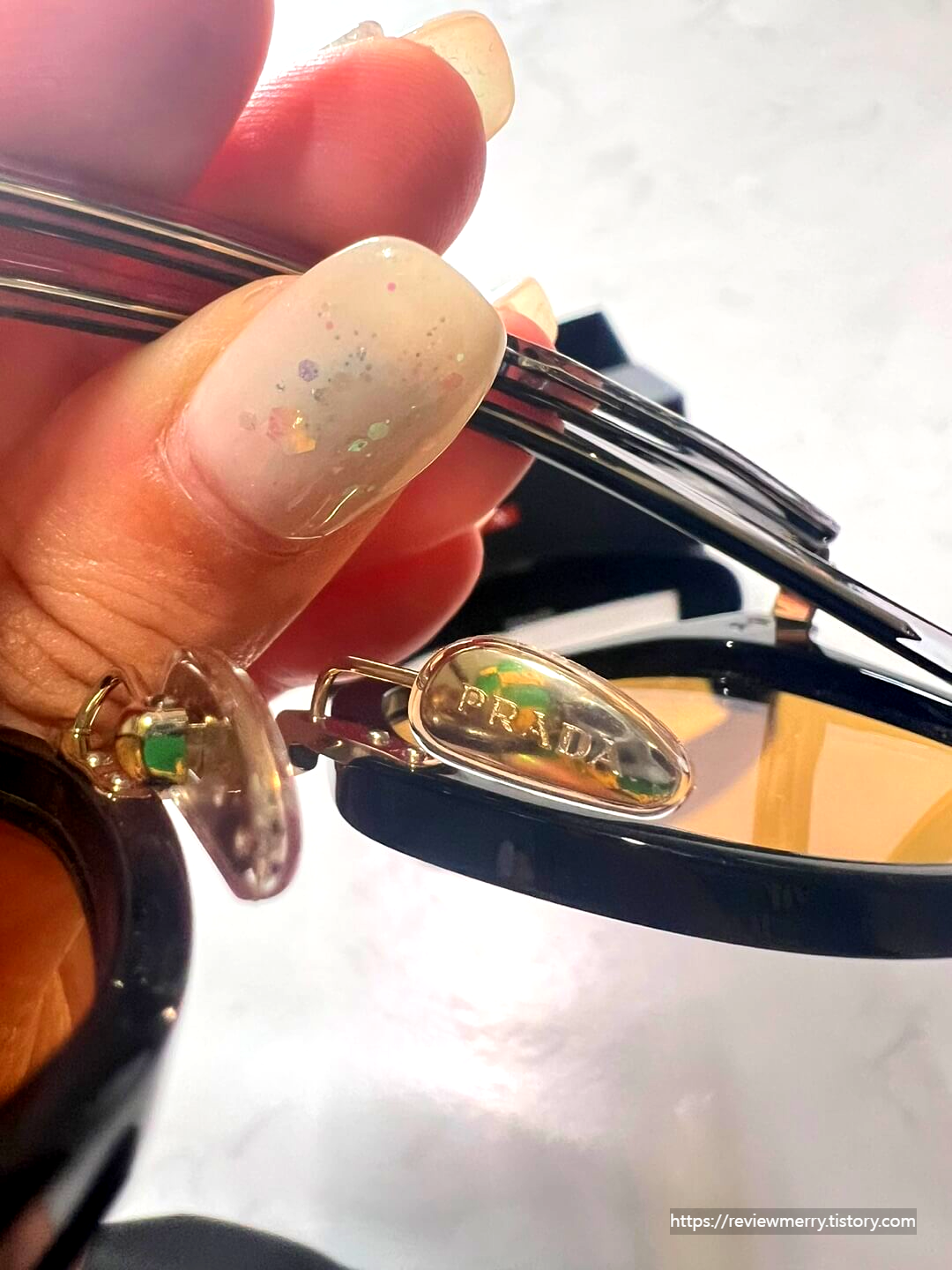 코를 지지하는 부분과 다리 쪽에 프라다 로고가 적혀있고, 다리 쪽은 메탈 프레임에 음각으로 각인되어 있어 고급스러운 느낌을 주어서 좋았어요.