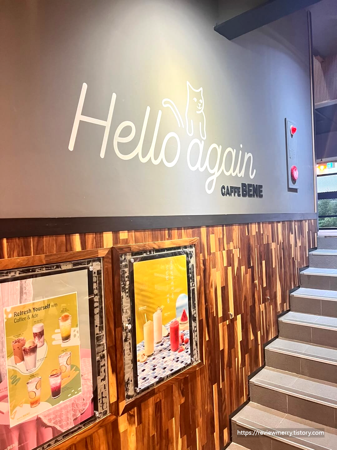 1층에서 2층으로 올라가는 계단에는 Hello Again cafe bene라는 문구가 적혀있는 걸 보고 정말 카페베네가 다시 새롭게 시작했구나..! 하는 느낌이 들었답니다.