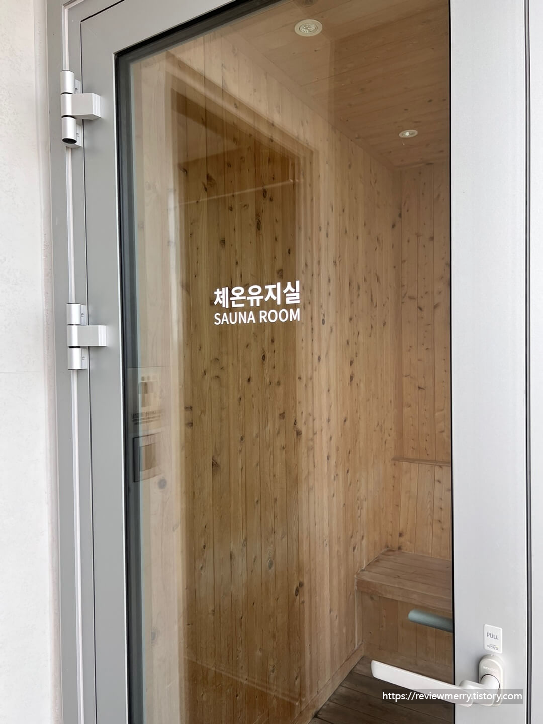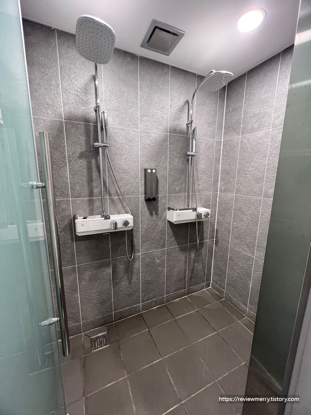 샤워실과 변기는 세면대 공간 안쪽으로 따로 구성되어 있으며 씻고 나와서 넓은 세면대 공간에서 물기를 닦고 옷을 갈아입는 게 가능해서 매우 편리했다. 평소 펜션에서 샤워 후 화장실 안에서 옷을 다 입고 나와야 하는 점이 매우 불편했는데 세면대 공간이 넓게 따로 존재해서 이곳에서 쾌적하게 탈의가 가능해 너무 마음에 들었다.