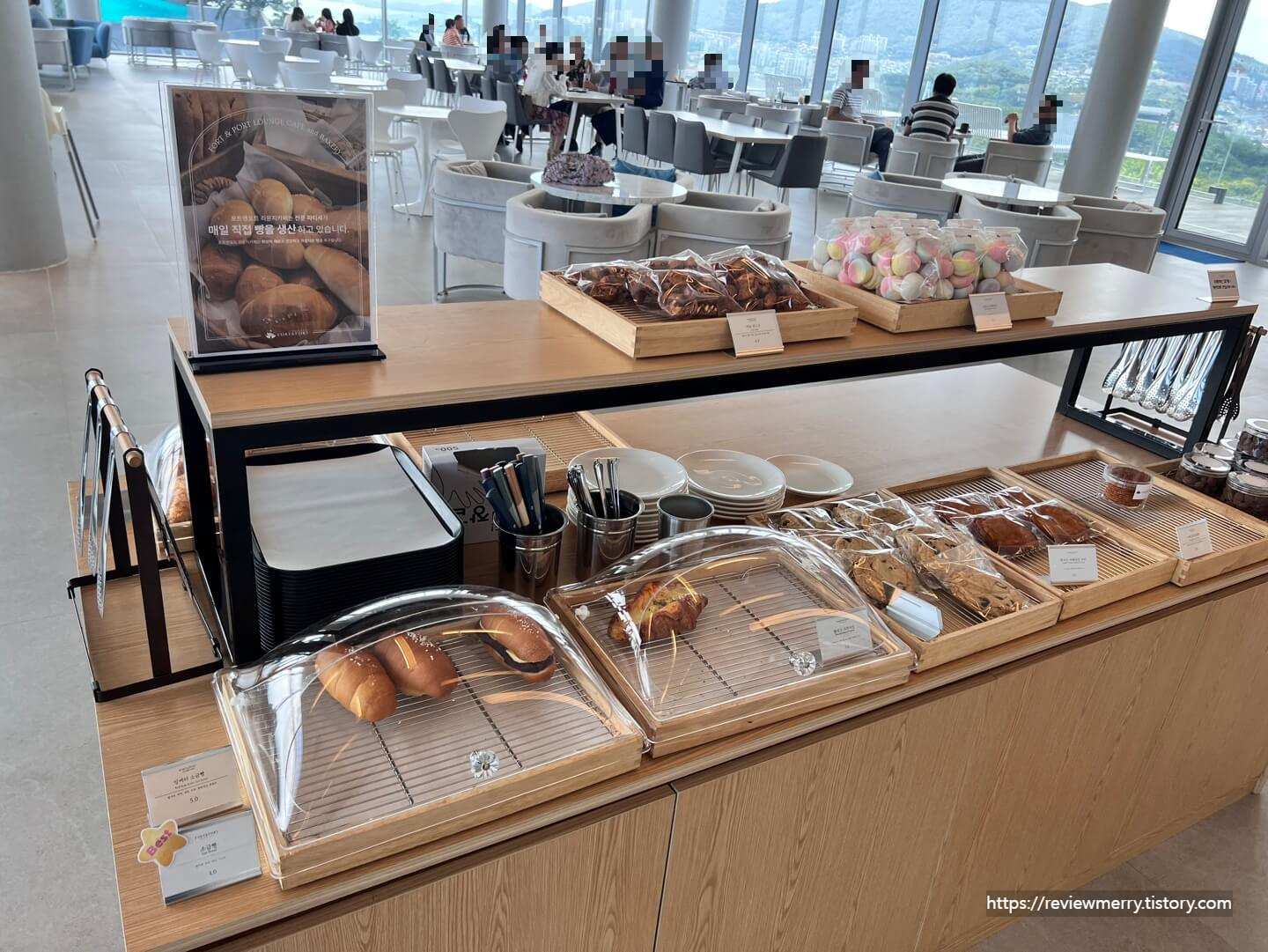 카페 내부는 굉장히 넓으며 어느 자리에 앉더라도 오션뷰를 볼 수 있다. 야외 자리도 마련되어 있고 루프탑으로 올라가면 돔과 간이 의자들이 마련되어 있지만 루프탑의 경우 난간과 떨어짐 주의에 의해 노키즈존으로 운영되고 있다.