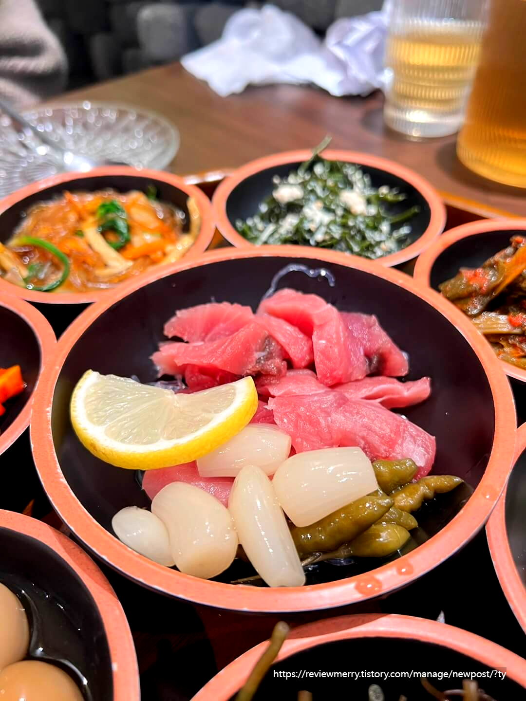 처음 세팅은 물을 가져다주시는데 물도 일반 플라스틱 물병과 생수가 아닌 결명자 차가 담긴 유리병이라 여기서 또 사장님의 사소한 챙김을 느낄 수 있었답니다.