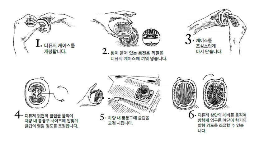 앞서 설명한 것처럼 리필용 디퓨저를 케이스 안에 넣어 사용하며, 공기를 통해 발향되는 형태이기 때문에 차량 내 통풍구에 설치하여 에어컨 ON시 강하게 발향을 느낄 수 있다.