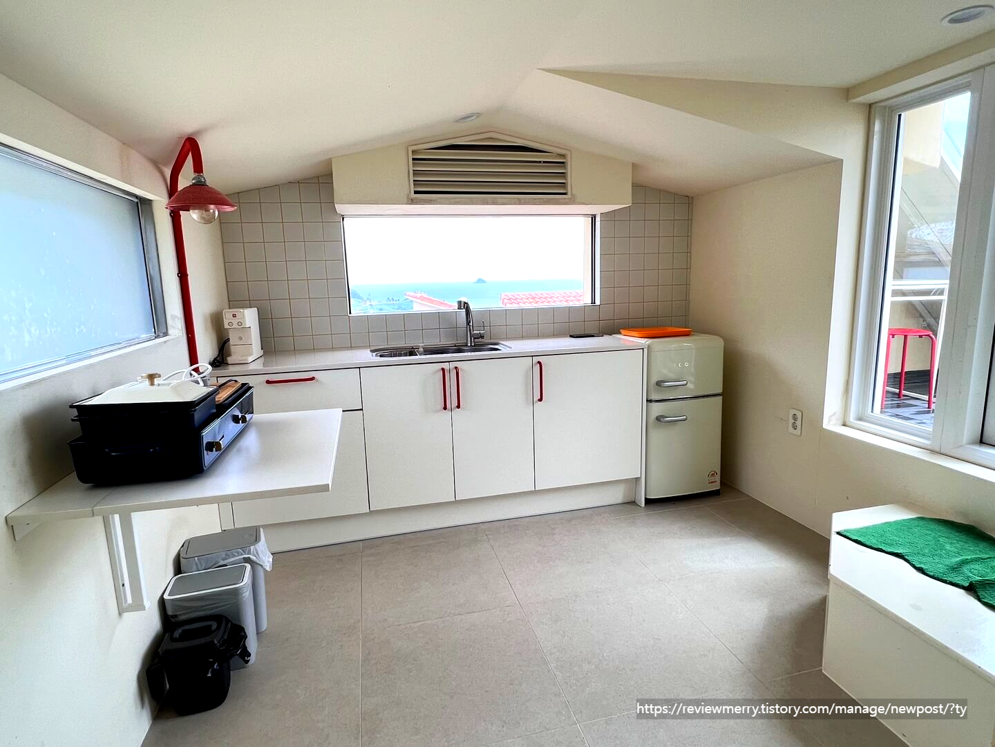 부엌과 연결된 테라스로 나가면 이러한 공간이 펼쳐지는데 저희가 방문한 날에는 비가 오고 있어서 테이블을 안쪽으로 옮겨두었었답니다. 하지만 저녁에는 비가 그쳐 위 테이블들을 꺼내 테라스에서 고기를 구워 먹었는데.. 남해바다를 보며 고기와 맥주를 즐길 수 있어서 너무 좋았답니다.