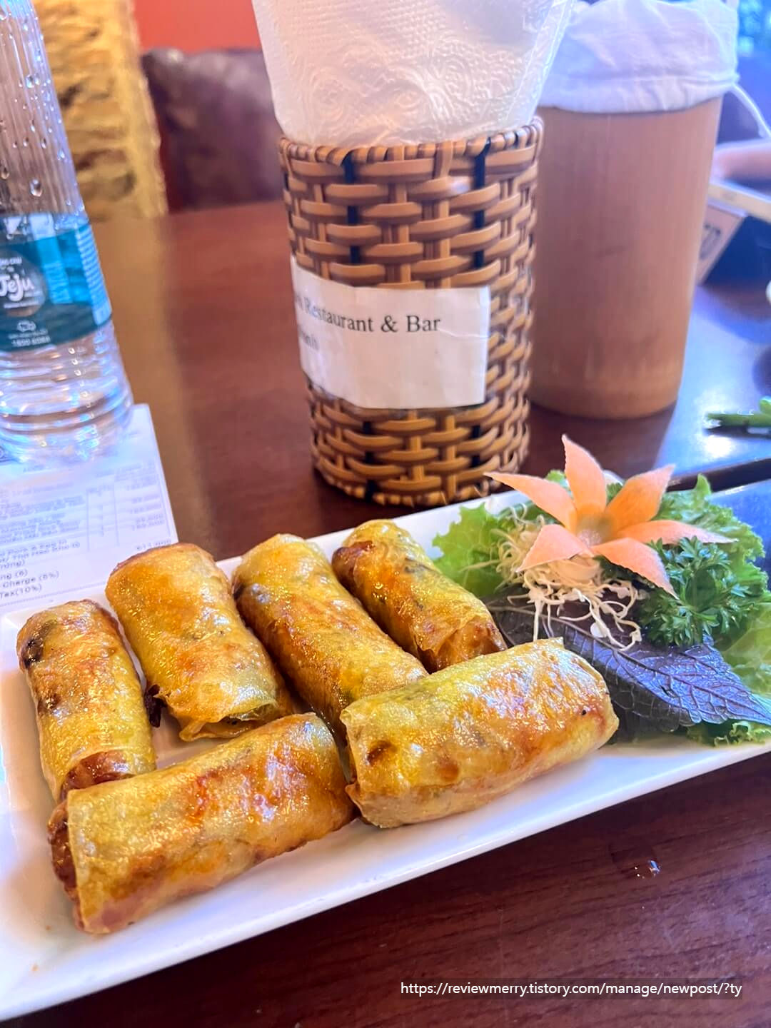 우선 스프링롤의 경우 새우와 소고기가 여러 야채들과 다져져 있고 겉은 바삭한 라이스페이퍼로 둘러져 있어 소스에 찍어먹으니 정말 맛있었답니다. 약간 만두와 비슷한 느낌이라 거부감 없이 먹을 수 있었답니다.