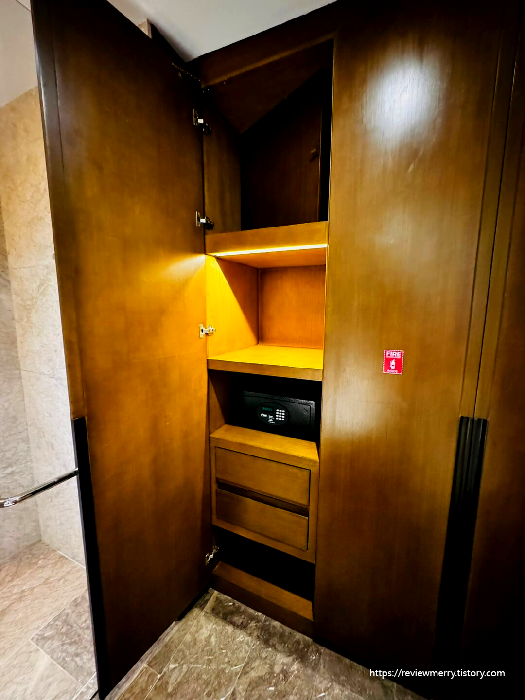 화장실 바로 앞에 있는 옷장은 열어보면 좌측은 금고와 수납장, 우측은 옷장이 있어요.