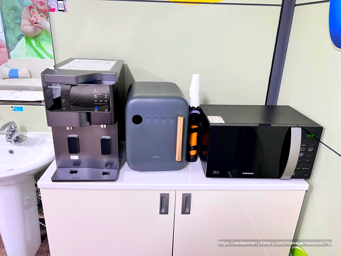 분유를 데울 수 있는 전자레인지, 정수기 그리고 젖병소독기와 체온계까지!!